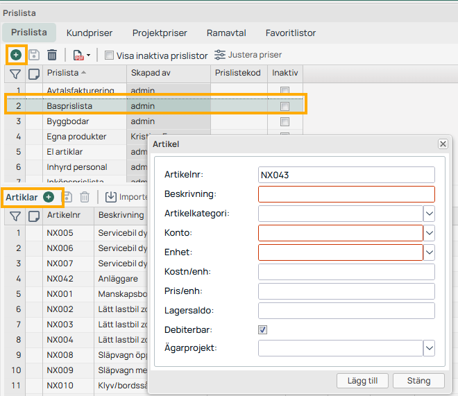 Price lists can be seen as your base price list directed at the customer. Once an article is included in a price list, you can then import these and specify unique prices for different customers, projects, or framework agreements. These are managed in their respective tabs.