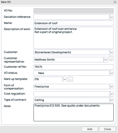 Click on Add. The Variation Order is now created, and you can start adding materials to it. For the Variation Order to appear on the mobile device, the status must be set to at least Ordered.