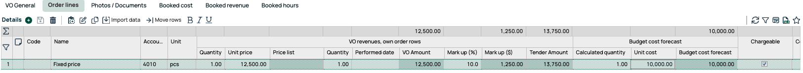 If the Variation Order is on a fixed price: The sum of budgeted/calculated revenues (calculated order lines on the Order Lines tab, including surcharges). Performed quantities won't be included; only calculated order lines are considered for the budget. Á-pris (unit price) on the order line is required.