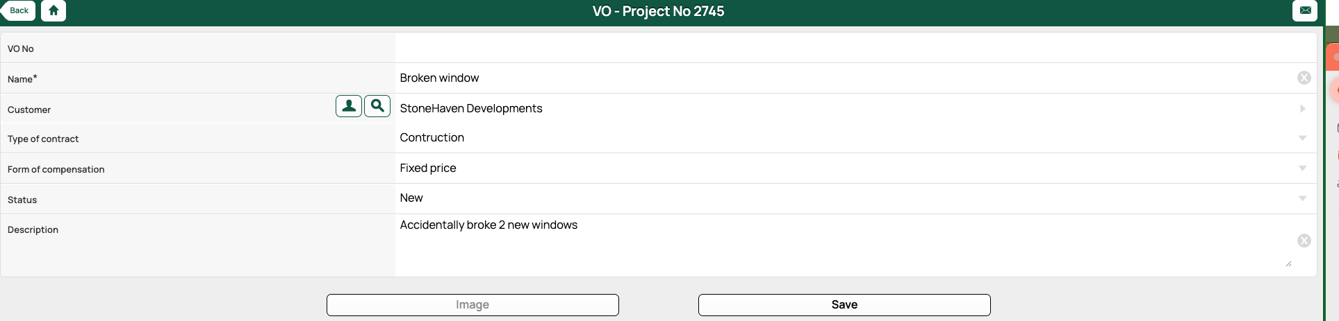 Fill in the details about the Variation Order (description, customer, type of Variation Order, compensation form, etc.).