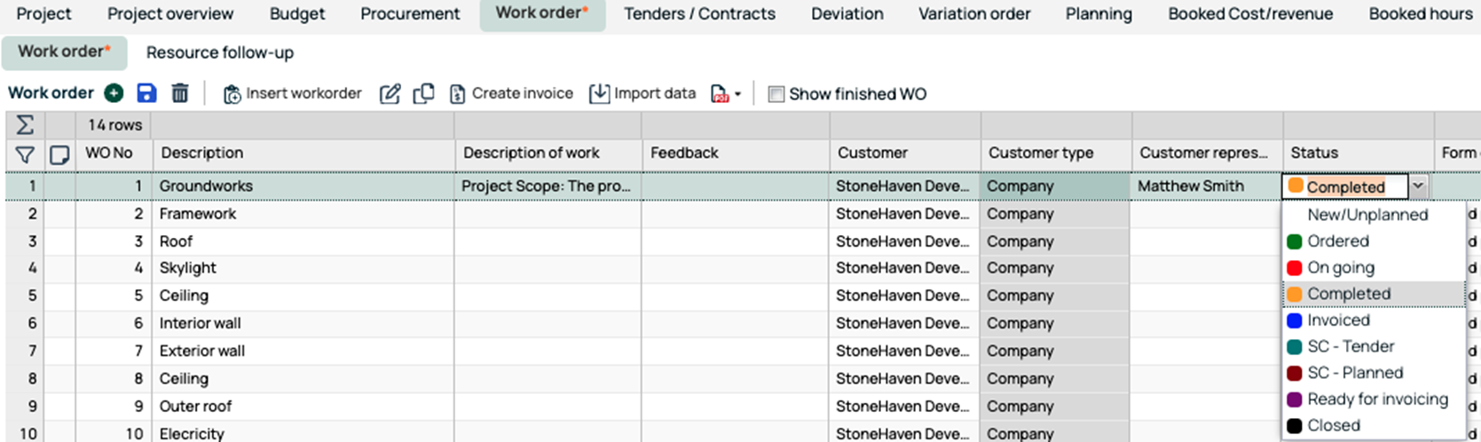 Using the filter function, you can filter out the work orders you want to invoice, for example, those marked with the status "Completed".