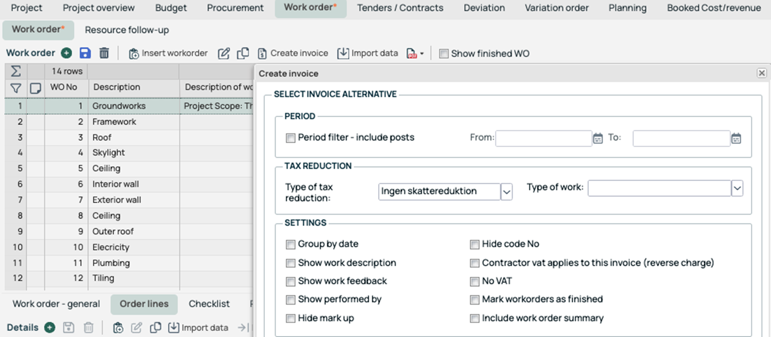 This article describes how to invoice from Work Orders. Invoicing for work orders is done from the Work Order module. This mainly applies to you who work with service cases or ongoing projects where you have divided a project into activities/subtasks in the work order module.