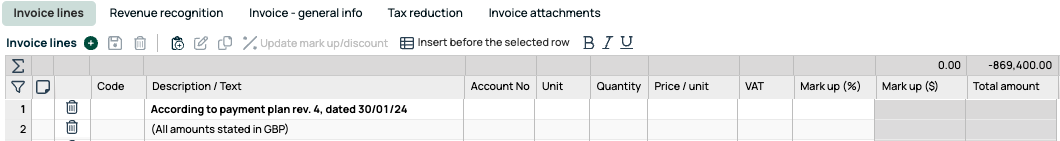 Note: For a manual credit invoice, a negative amount or a negative quantity must be manually specified for the entries in the invoice lines. The sum of a credit must be a negative amount.