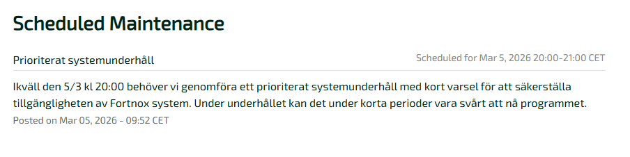 Fortnox will perform scheduled and prioritized system maintenance on the evening of March 5th starting at 8:00 PM to ensure availability of the Fortnox system.