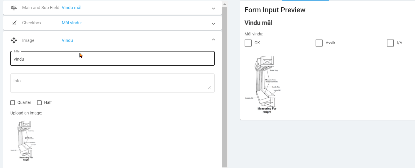 En ny feature i forms builder er "Image". Denne gir deg mulighet til å legge ved et default image (fast bilde) i sjekklisten.