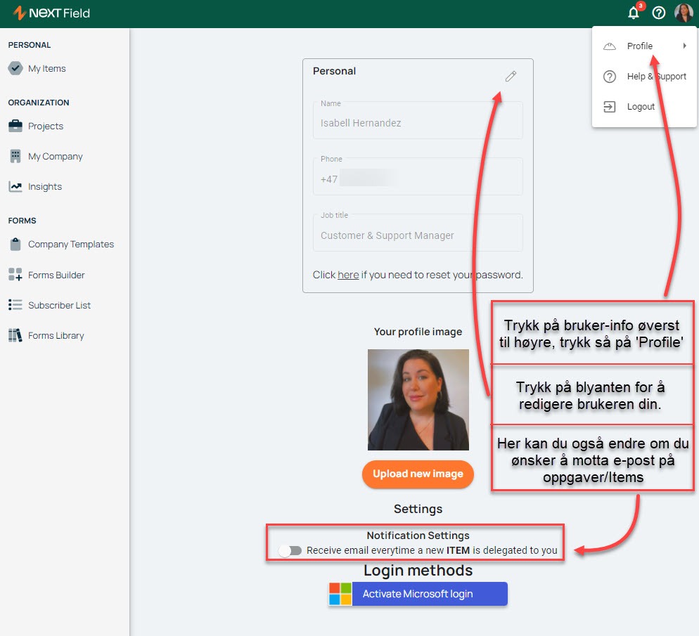 Ønsker du mailvarsling på alle oppgaver du mottar? Skrev du inn feil navn da du registrerte deg i Next Field (CHECKD), og heter nå "klaskelars69" i alle prosjekter? Eller ønsker du å legge inn telefonnummeret ditt? For å oppdatere profilen din følger du disse enkle stegene: