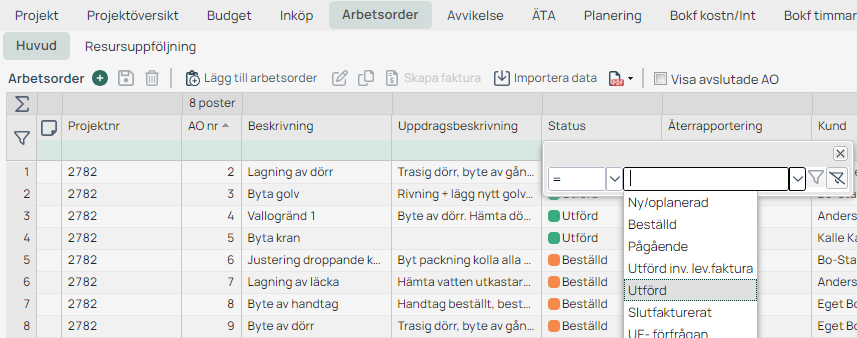 Med filterfunksjonen kan du filtrere frem de arbeidsordrene du vil fakturere, for eksempel de som er markert med status "Utført".