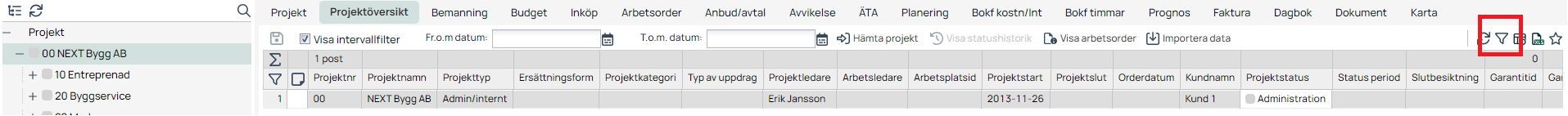 Denne funksjonen er generell i Next Project. Eksemplet nedenfor gjelder Prosjektoversikten, men prinsippet er det samme i alle moduler som har filterfunksjonen.