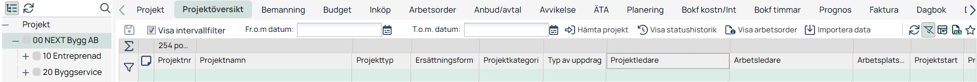 Åpne den modulen du vil filtrere frem opplysninger i, for eksempel Prosjektoversikten. Marker det nivået (prosjektet) i Prosjekt-treet som du vil filtrere frem opplysningene for, alternativt det nivået og de underliggende prosjektene.