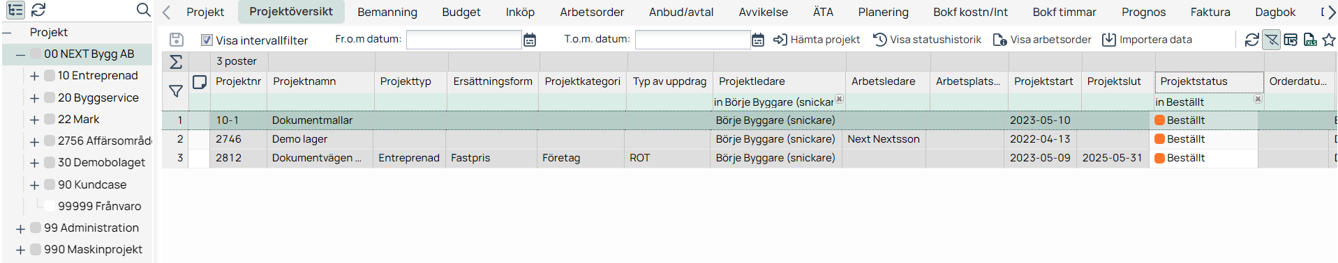 Resultatet vises øverst, i dette eksemplet for alle prosjekter som har status bestilt for den valgte prosjektlederen i det markerte prosjektet og de underliggende i prosjekttreet.