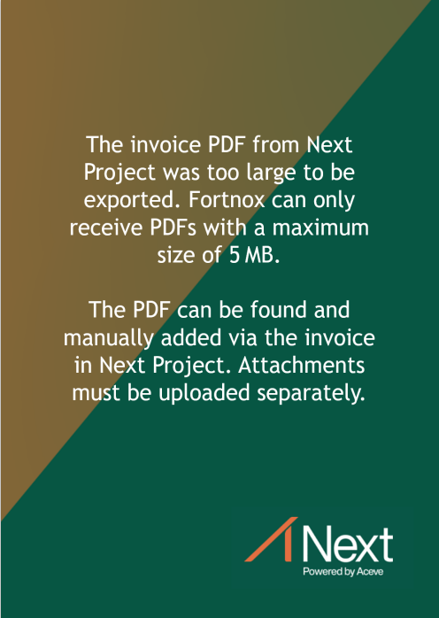 Kundfakturans pdf exporteras till Fortnox, men med en gräns på 5MB. Detta är en begränsning i Fortnox. Om pdf:en är större än 5MB kommer en standard pdf som innehåller information om att pdf:en finns i Next Project att exporteras.