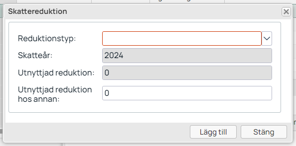 Utnyttjad reduktion hos annan fylls i om kunden redan har utnyttjat en del av sin totala pott hos annat bolag alternativt om du har fakturerat kunden tidigare från ett annat system än Next Project. Poster som läggs till kommer automatiskt att landa på det aktuella året.