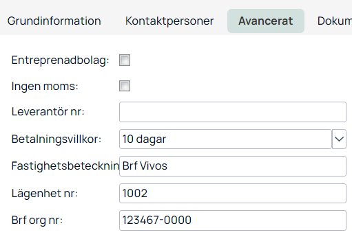 Under fliken ´Avancerat´ i kundregistret behöver du fylla i uppgifter som ligger till grund för ansökan om skattereduktion. De uppgifter som är viktiga att kontrollera på kunden är att nedan uppgifter finns registrerade