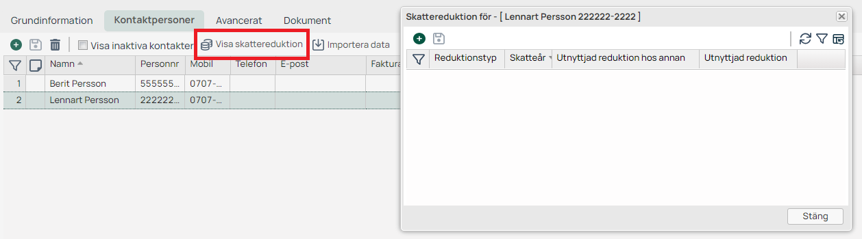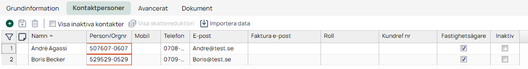 För att kunna fördela skattereduktion på en kontaktperson krävs att den är ibockad som Fastighetsägare då bocken som styr vilka kontaktpersoner som visas under fakturafliken när beloppet ska fördelas. Det gör du i underfliken ´Kontaktpersoner´.