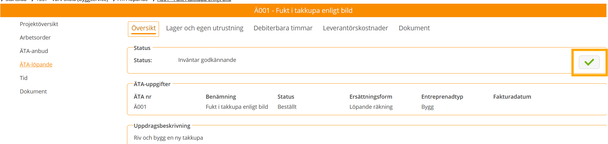 När du som beställare trycker på OK så lagras godkännandet på ÄTAn och visas i Next Project, se bild nedan.