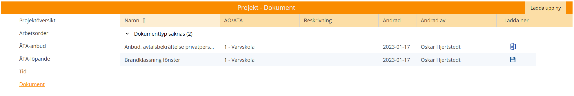 Här kan du ladda hem dokument som är delade i projektet, men även ladda upp egna dokument och bilder via knappen ´Ladda upp ny´, högst upp till höger. Var noga med att ange Dokumenttyp på dokumentet för bättre översikt.