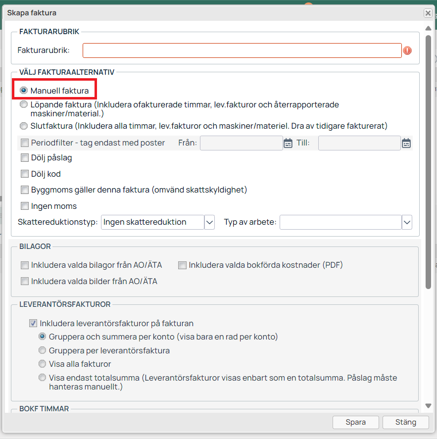 När du bockat i manuell faktura går det inte att välja att inkludera bilagor, leverantörsfakturor, bokförda timmar eller orderrader som rapporterats på projektet.