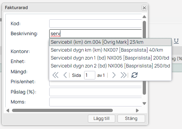 I fältet beskrivning kan du söka efter den artikel du vill lägga till.