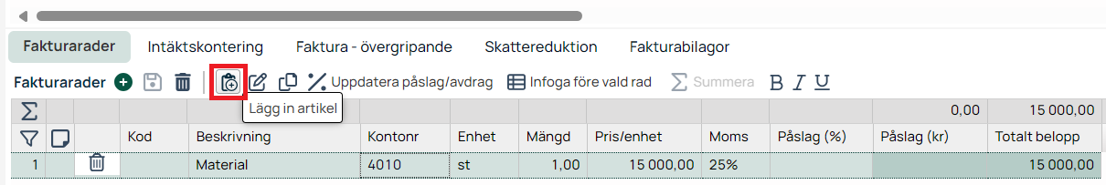 Du kan även hämta in artiklar från er prislista till fakturan, genom knappen Lägg in artikel.