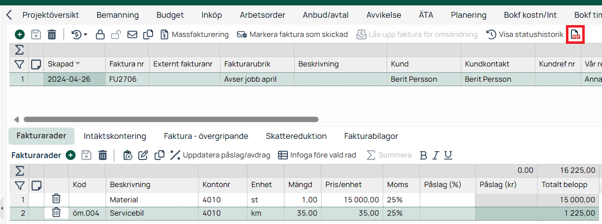 OBS! Ändringar som görs i fakturarader generaras endast en ändring på fakturan och inte i någon annan modul. Exempelvis om du lägger till extra timmar för en hantverkare i fakturan kommer det inte fler timmar under modulen Bokf timmar.