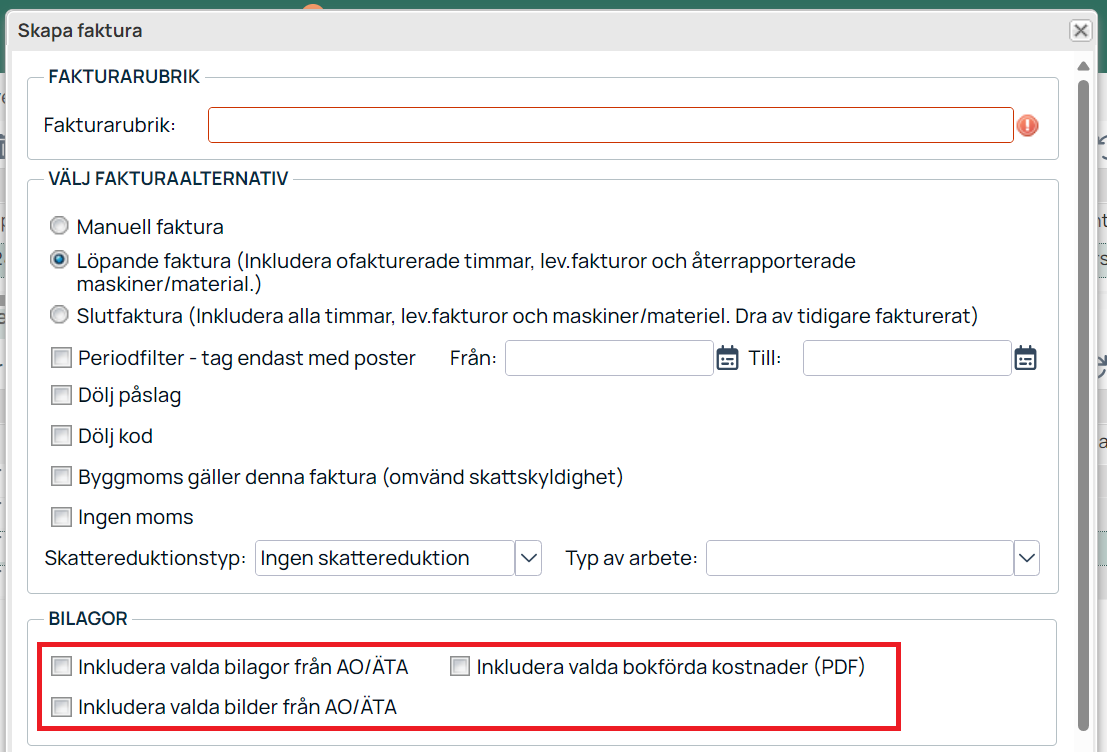Vid skapande av en löpande faktura kan du välja vilka bilagor du vill inkludera till fakturan när du skapar fakturan.
