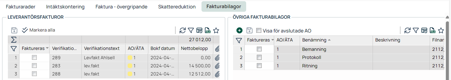 I vänstra vyn ser du alla leverantörsfakturor som är bokförda mot projektet och som är markerade som debiterbara i modulen Bokf kostn/Int. I den högra vyn ser du övriga fakturabilagor kopplade mot projektet.