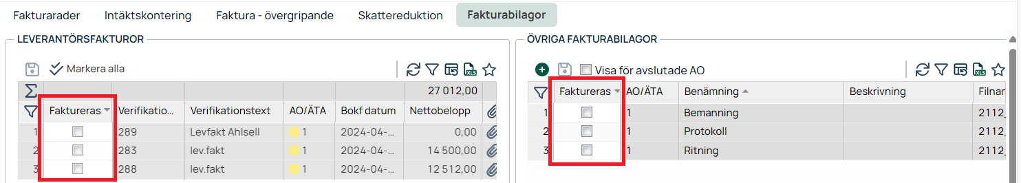 I båda vyerna kan du markera de bilagor du vill skicka med genom att klicka i bocken faktureras.