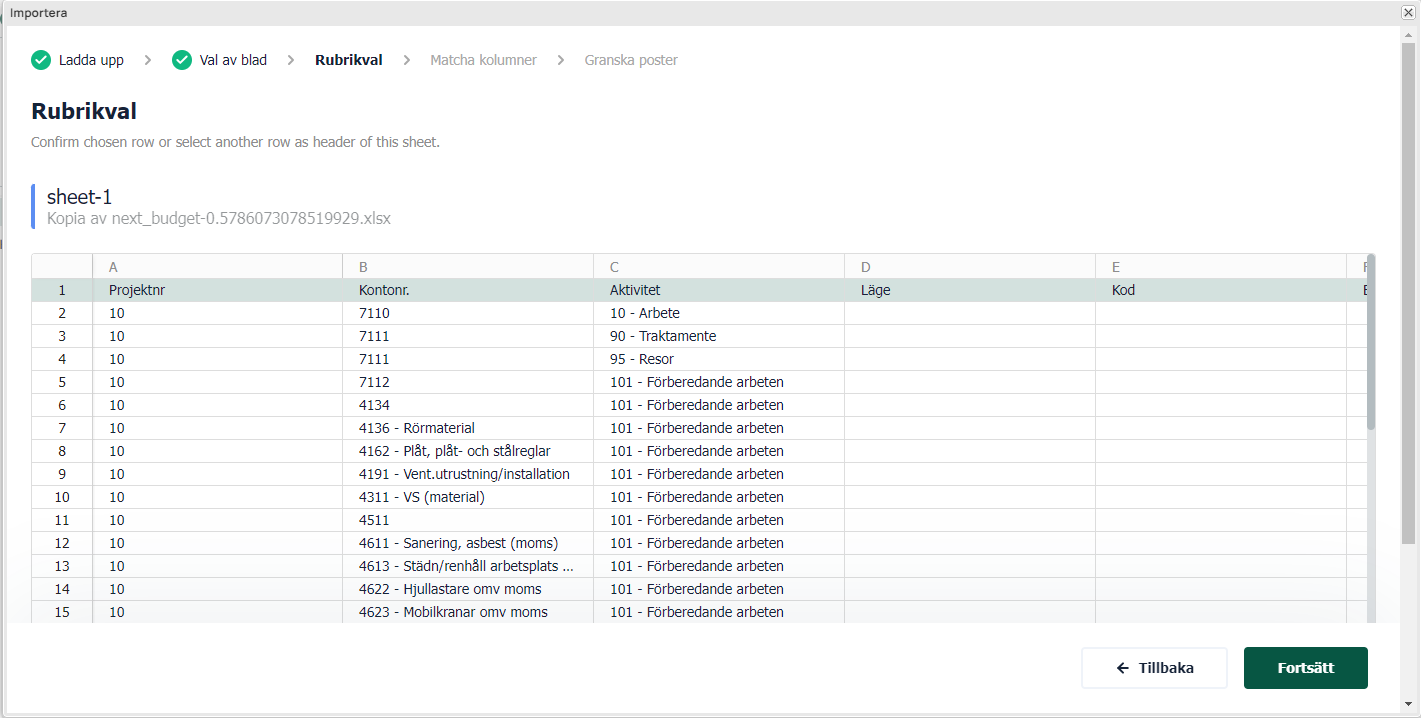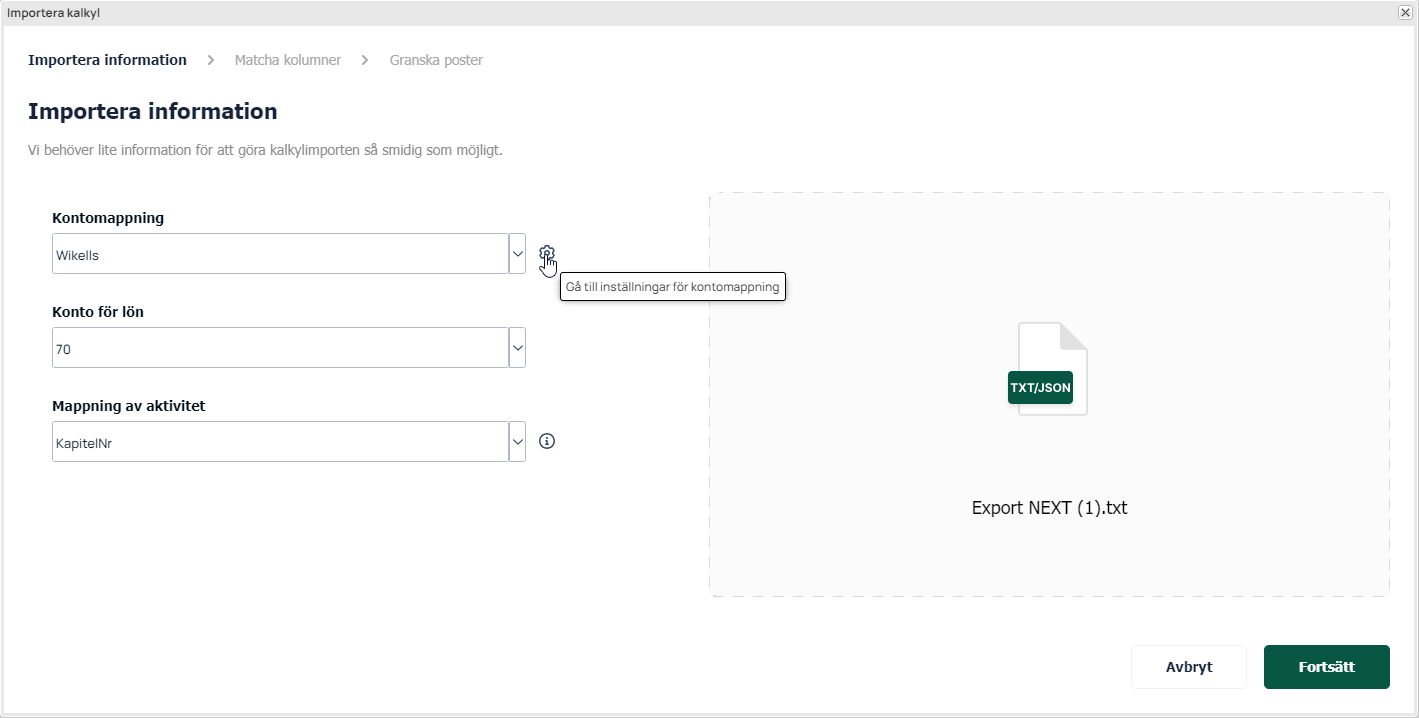 När filen har laddats upp så går det att byta kontomappning (se mer under avsnittet kontomappning). Utifrån konotmappningen föreslår systemet ett konto där arbetskostnad (Konto för lön) hamnar, detta går att byta i det här steget. Importen känner också av vilket system filen kommer ifrån och ger förslag på vilken data som kan användas som aktivitet i Next. Klicka på fortsätt så läses filen in och bearbetas.