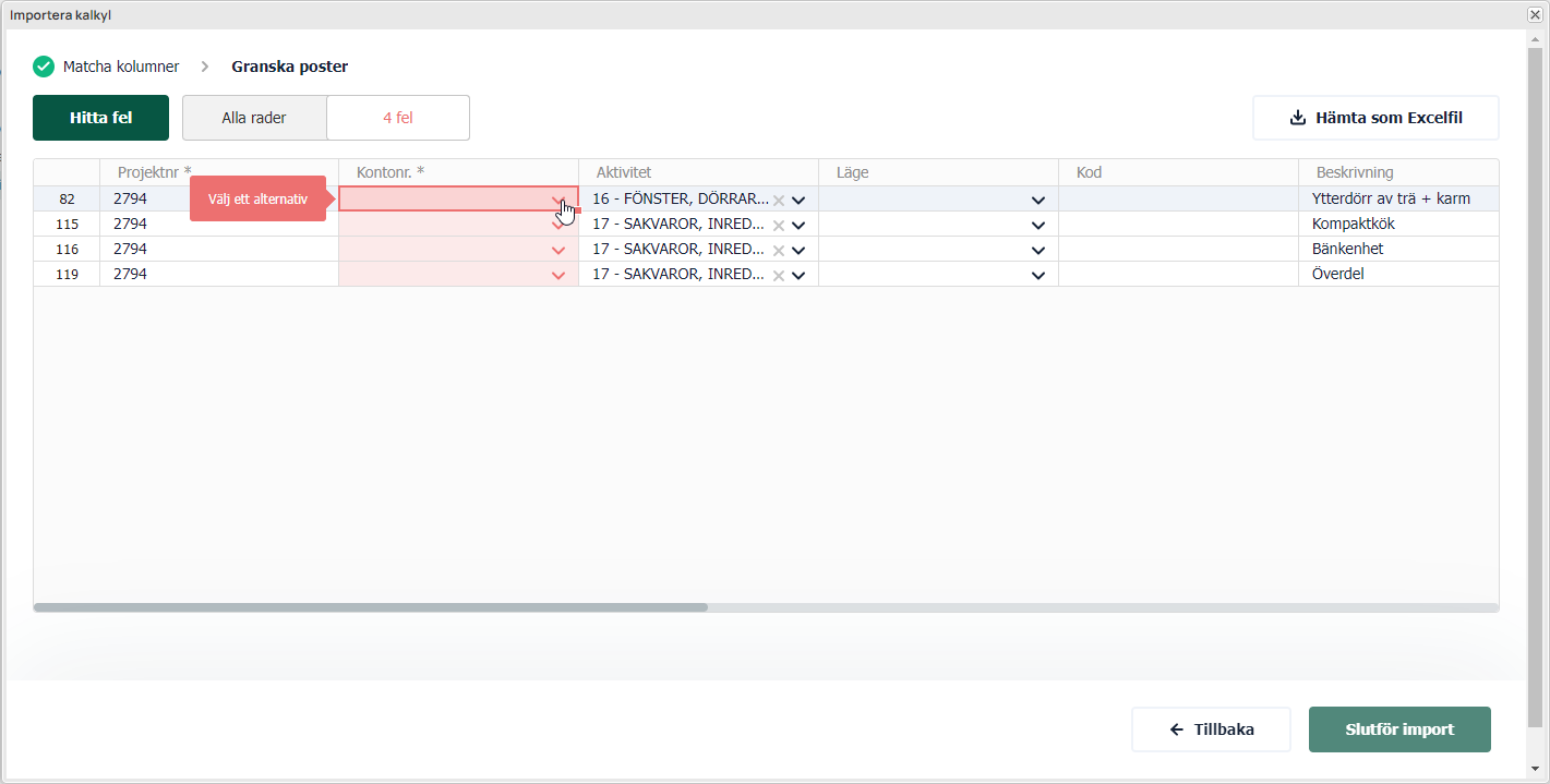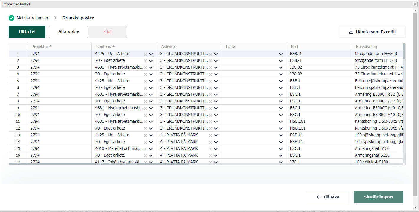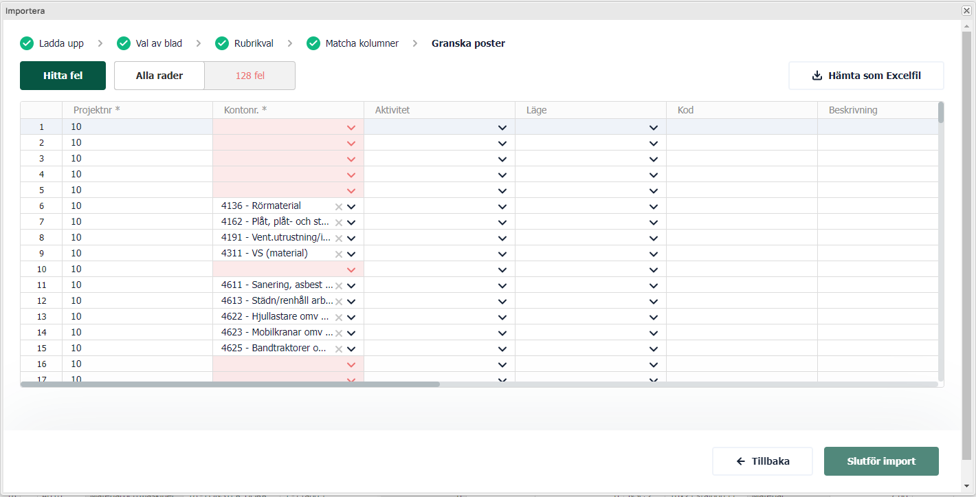 Efter matchningssteget så kan du granska posterna. Här har du möjlighet att redigera din importdata på liknande sätt som i Excel.