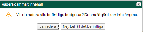 Om det redan finns en budget inlagd i systemet så kommer det dyka upp en dialog när importen ska sparas. Då kan man antingen radera den befintliga budgeten eller göra en kompletterande inläsning av nya rader.