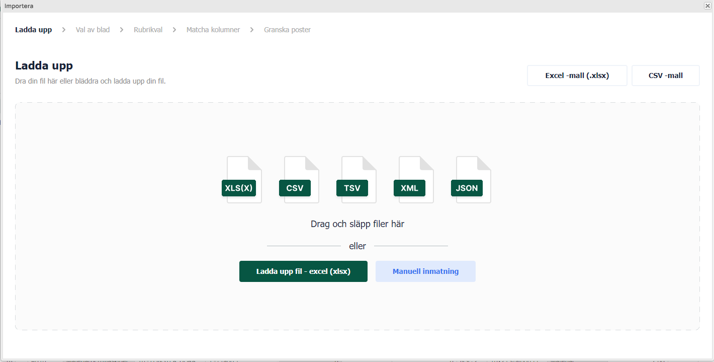 Filformat som stöds av importen är XLS(X), CSV, TSV, XML och JSON