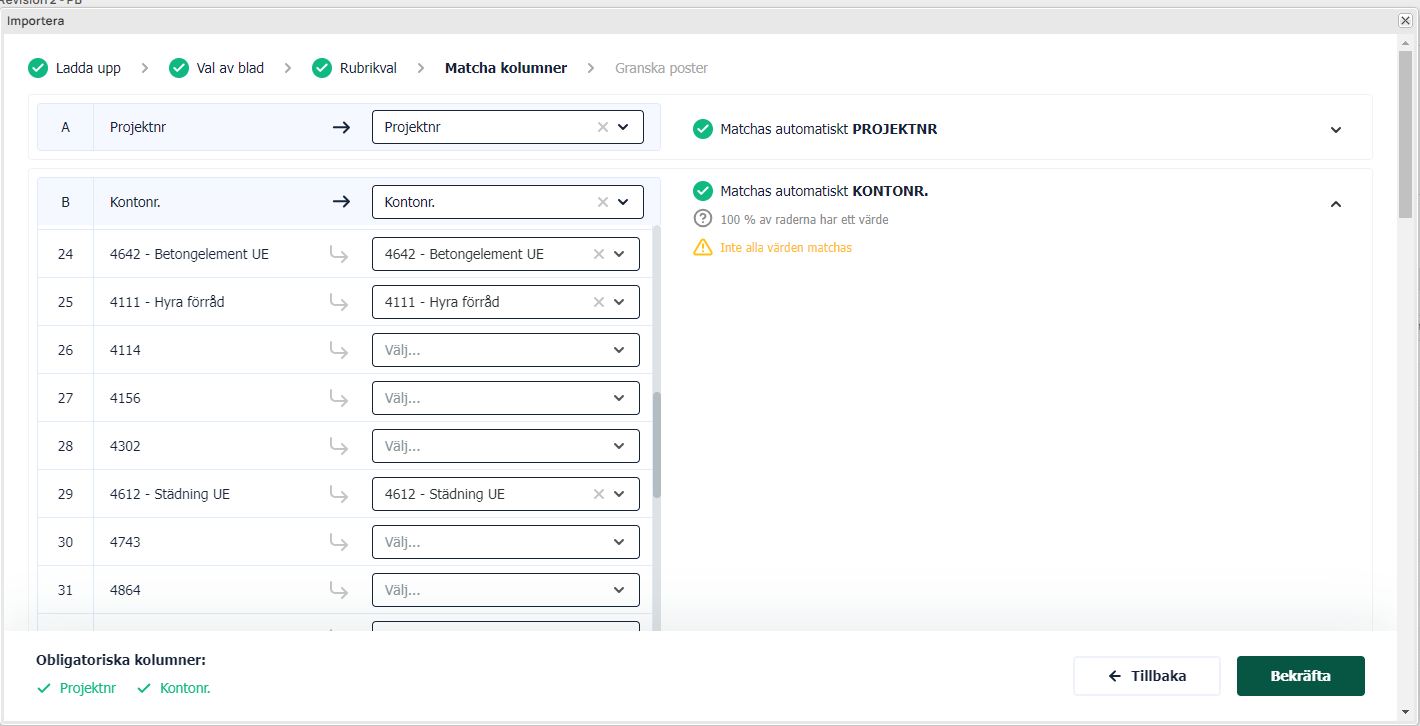 För vissa kolumner går det också att matcha data i filen mot specifik data i Next. Exempelvis: Konto, Enhet och aktivitet. Det är inte obligatoriskt att matcha varje konto mot ett motsvarande konto i Next. Det rekommenderas däremot att det görs i detta steg alternativt att importen avbryts och grunddatan i filen eller Next uppdateras.