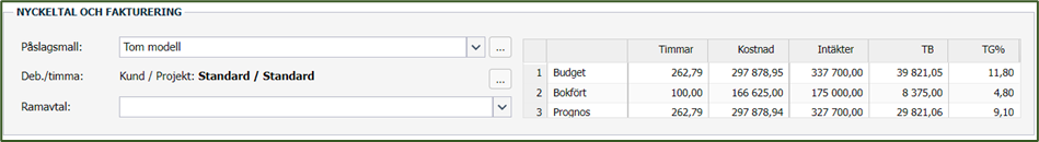 När budgeten är inlagd i Next så kommer nu projekt-kortet att fyllas på med budgeterade värden. Se raden Budget i rutan till höger i bilden nedan.