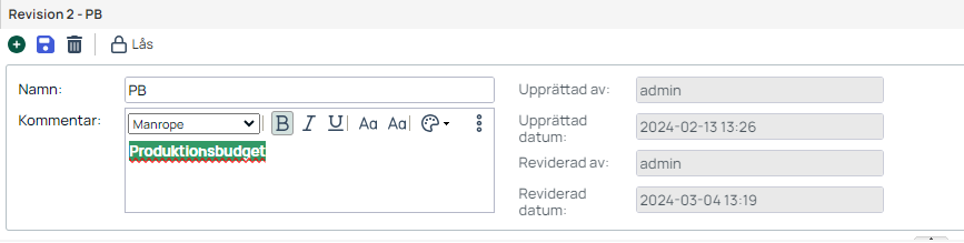 En budgetrevision kan ha ett namn och en kommentar. Varje revision visar även när den blev upprättad och reviderad samt av vem.
