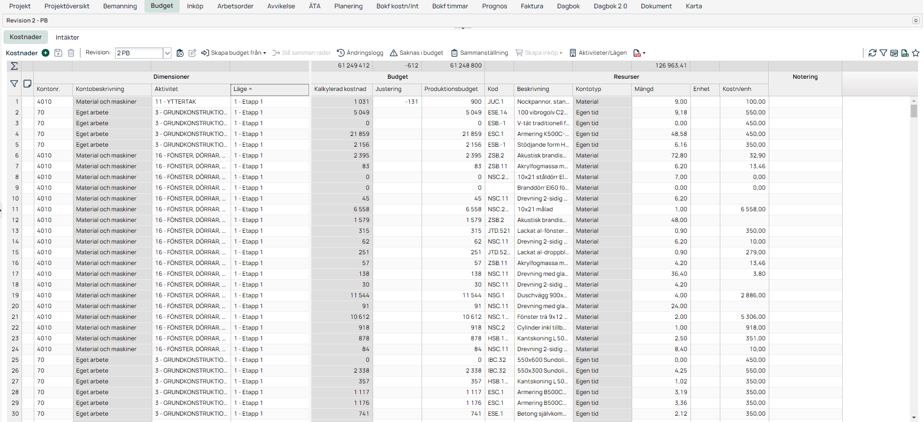 Redigera en budgetrad med möjlighet att hämta resurser från prislista eller timpriser. |
