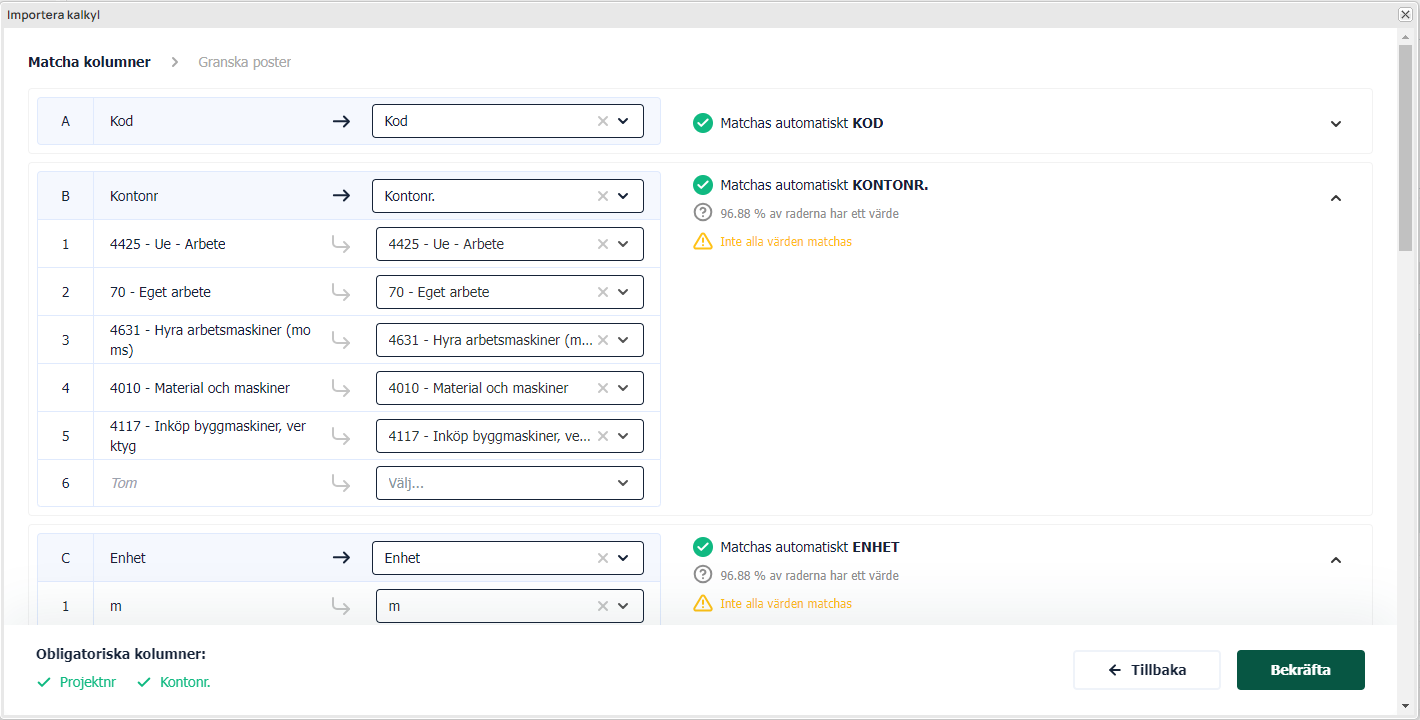 Om mallen från Next används så har kolumnerna matchats per automatik. Next kommer försöka att matcha kolumnerna även i andra filer om någon kolumn skulle sakna matchning så går det i detta steg att matcha detta manuellt.