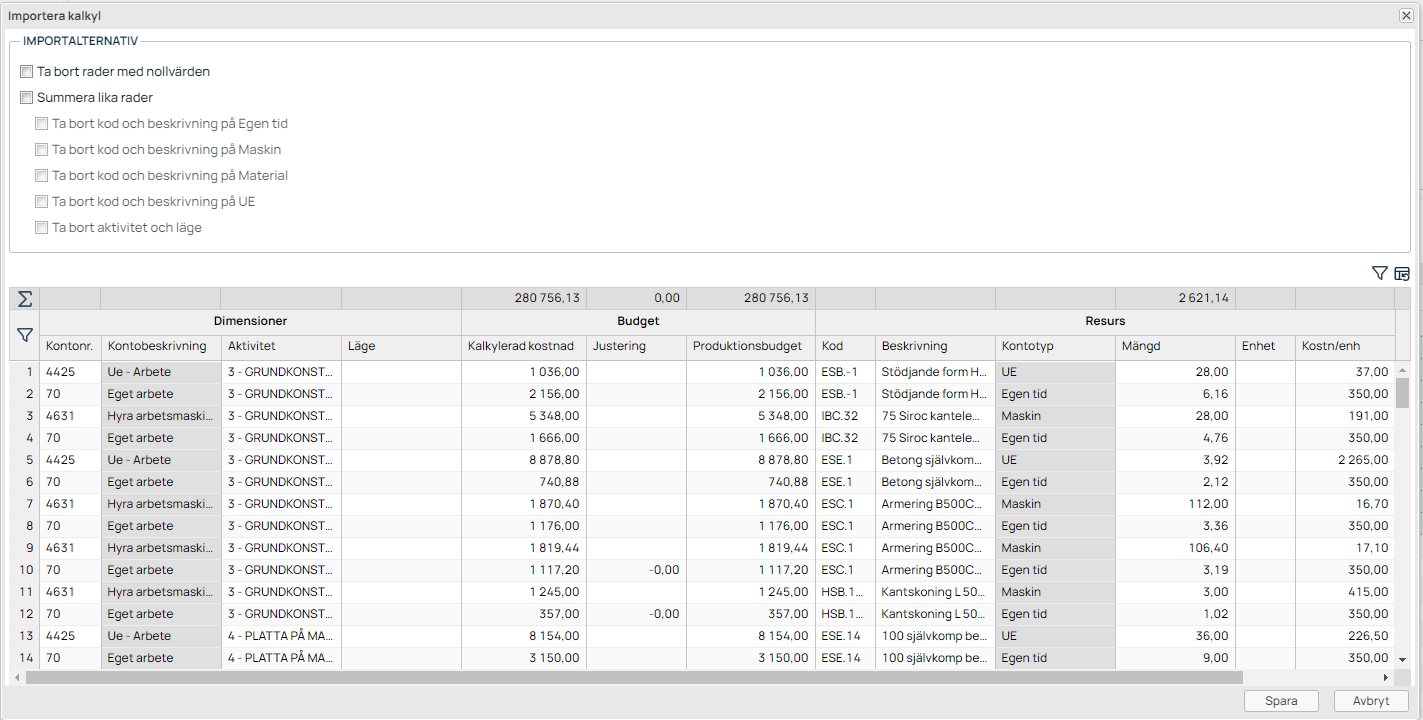 Sista steget i importen visas en förhandsgranskning av de budgetrader som kan importeras. Det går att redigera importen även här via importalternativen. Via importalternativen så kan Next plocka bort rader med nollbelopp samt summera lika rader. Vid summering av rader så finns också valen att ta bort viss information på rader för att dessa ska gå att summera. Data som kan plockas bort är aktivitet och läge samt kod och beskrivning för de olika resurstyperna i Next.