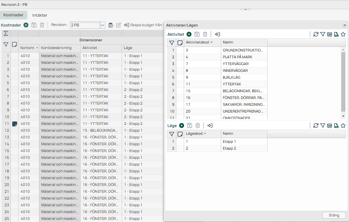 Bokf kostnad/intäkt/ Ändra Aktivitet/Läge |