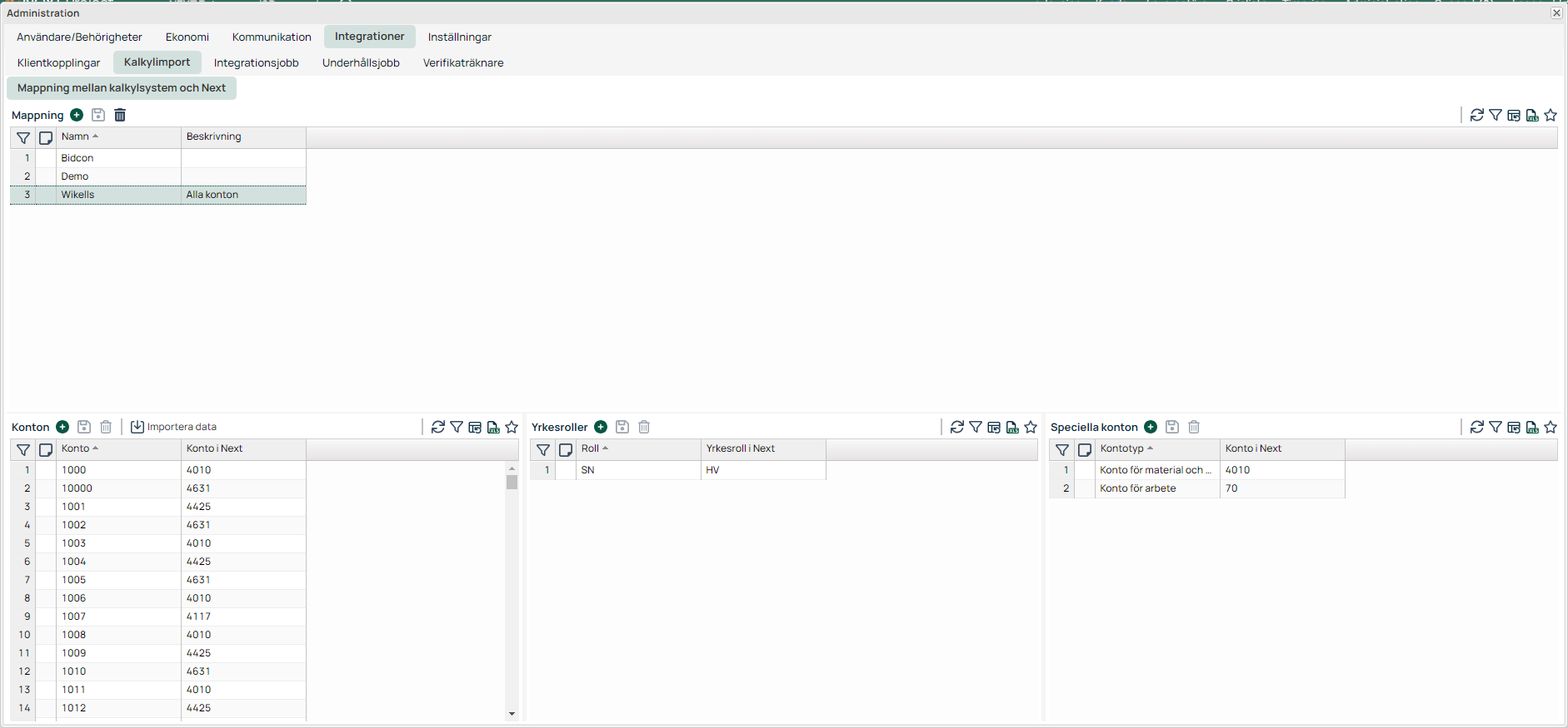 Mappningen består av Konton, Yrkesroller och Speciella konton.