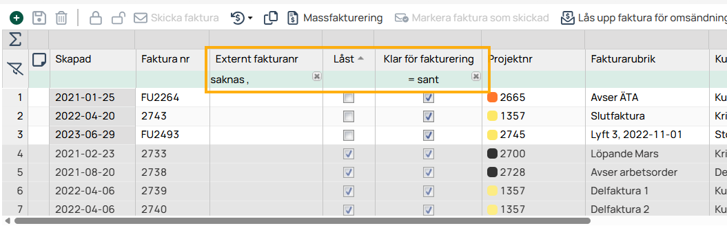 Filtrera fram fakturor som är redo att skickas till kund:-