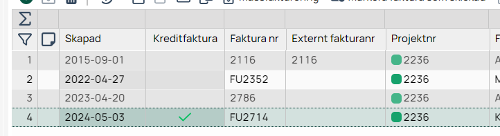 En kreditfaktura motsvarande debetfakturans hela belopp skapas och kolumnen Kreditfaktura markeras automatiskt (går inte att ange manuellt).