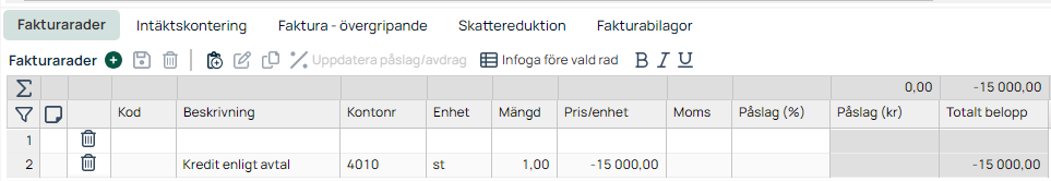 OBS! Vid en manuell kreditfaktura måste ett negativt belopp eller negativt antal anges manuellt på posterna i fakturarader. Summan av en kredit måste bli ett negativt belopp.