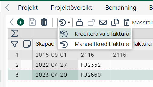 Markera fakturan du vill kreditera och klicka på valet Kreditera vald faktura i fakturamodulen.