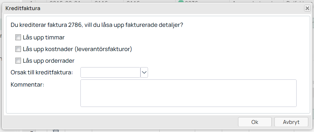 Det finns även ett textfält Kommentar där man kan ange ytterligare information kring t ex kreditfakturan.