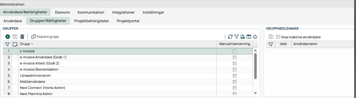 Lägga till de användare som ska kunna skicka fakturor via c-Invoice i gruppen ´c-Invoice´ genom att trycka i boxen på varje användare som ska ha rättigheten.