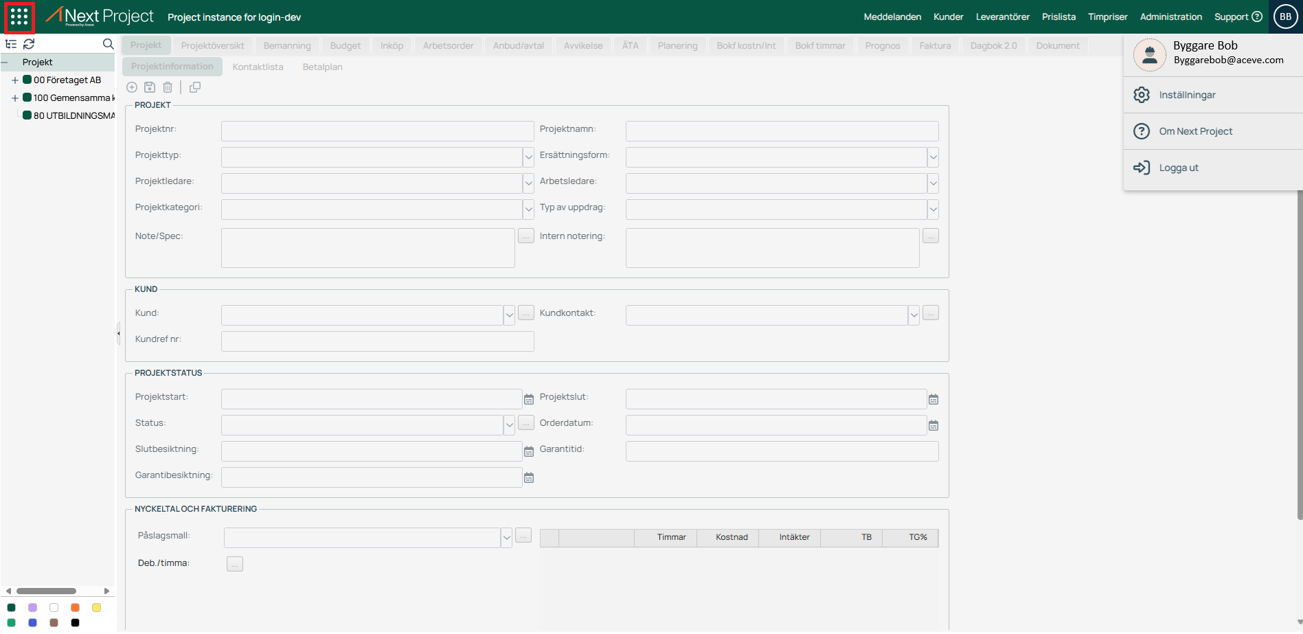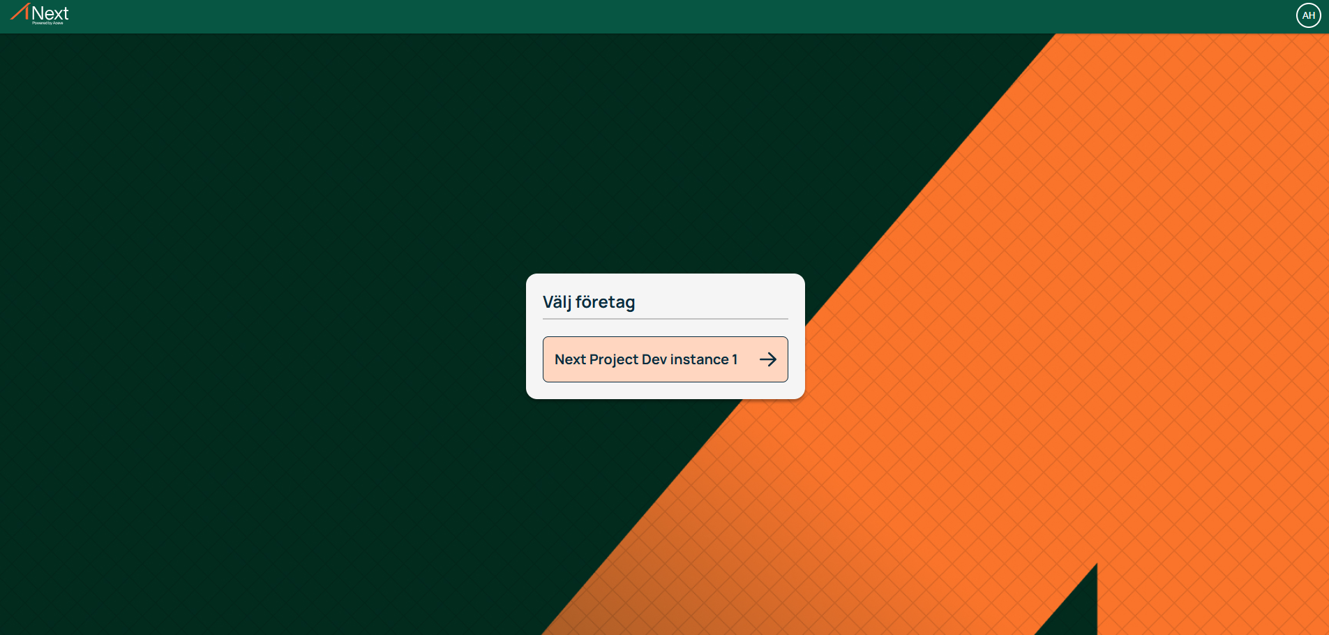Om en användare via sitt Next ID har åtkomst till flera olika Next Project databaser (bolag) så syns en knapp med prickar i vänstra hörnet. Denna knapp ger möjlighet att öppna de olika bolagen. De öppnas i en ny flik i webbrowsern men du behöver inte logga in igen, du förblir inloggad.