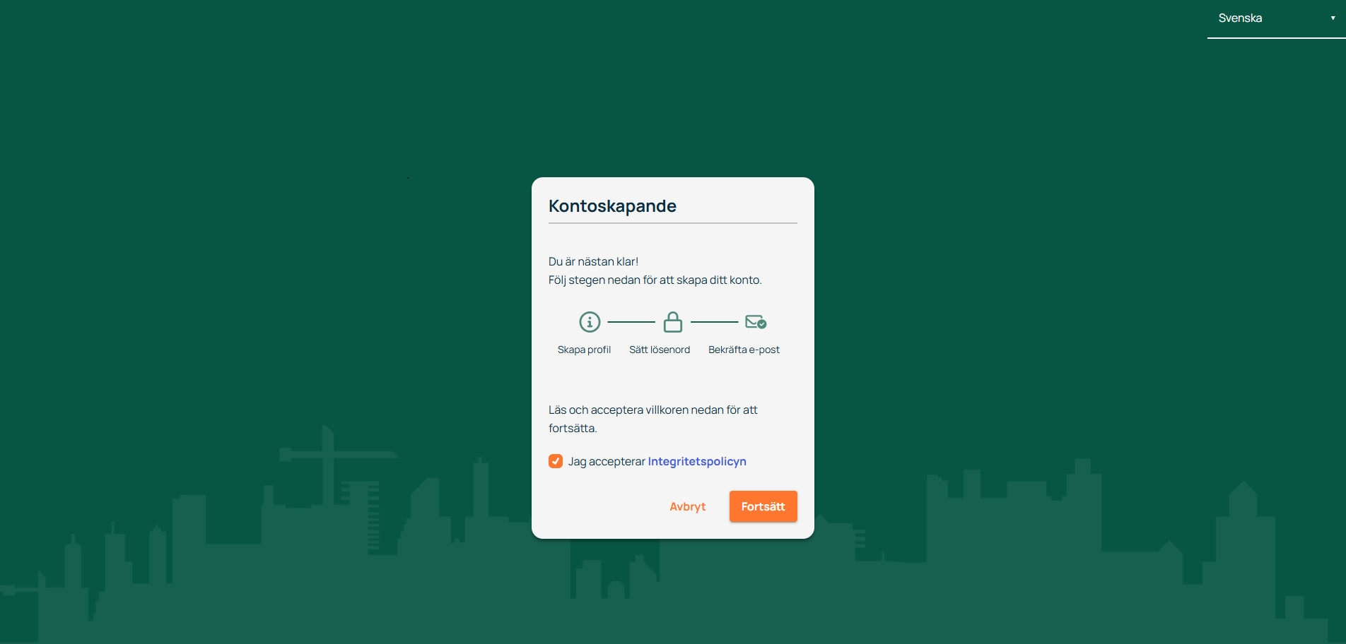 Användaren måste godkänna integritetspolicy. Här ser man också de få steg som användaren behöver gå igenom för att bli klar.