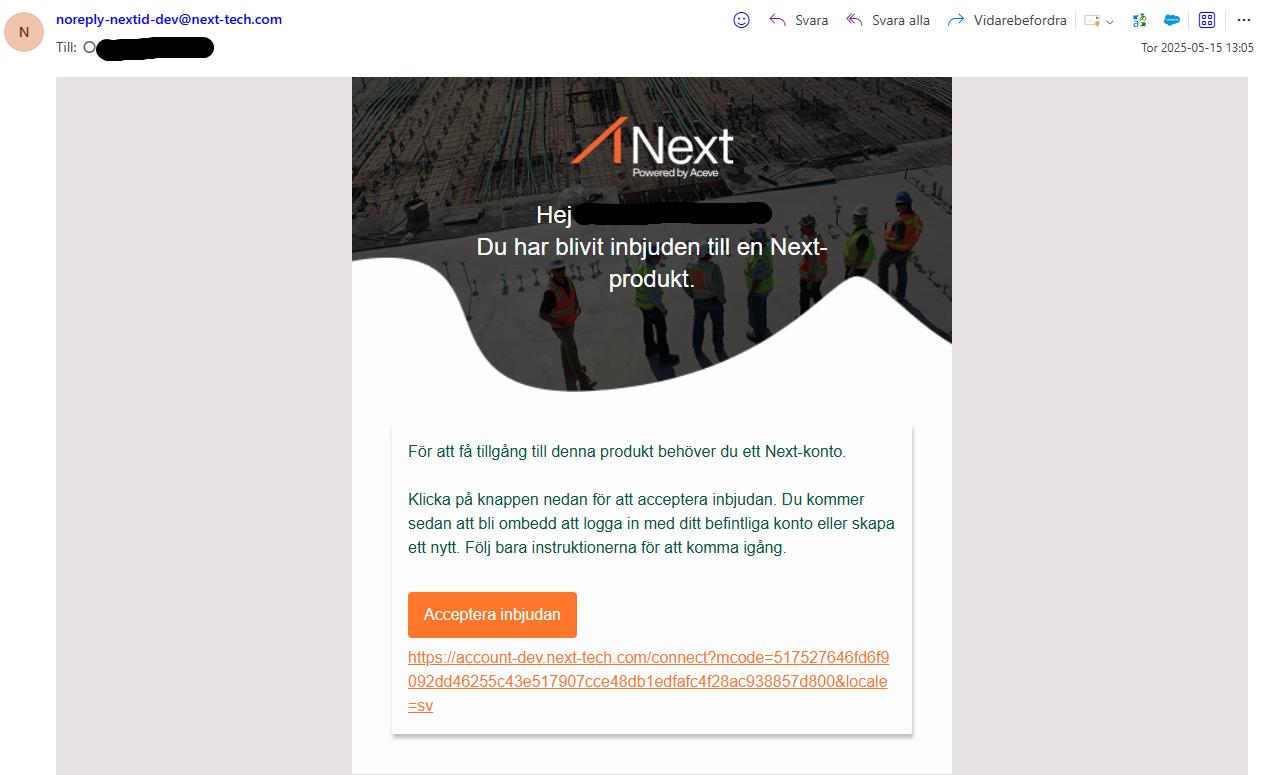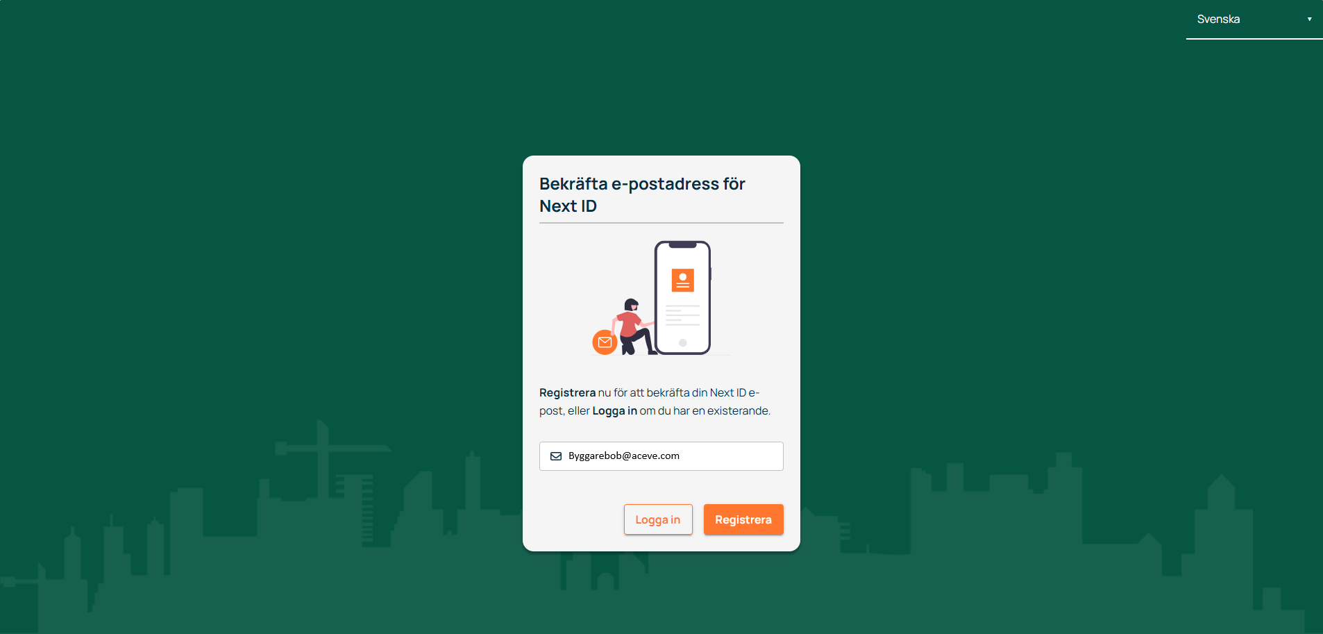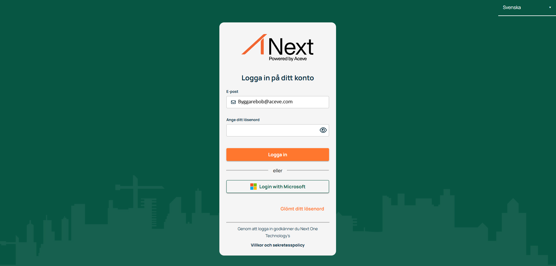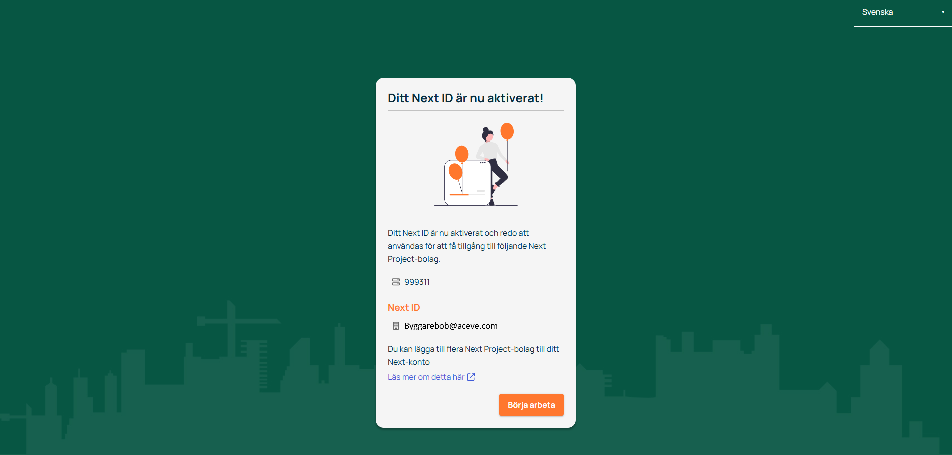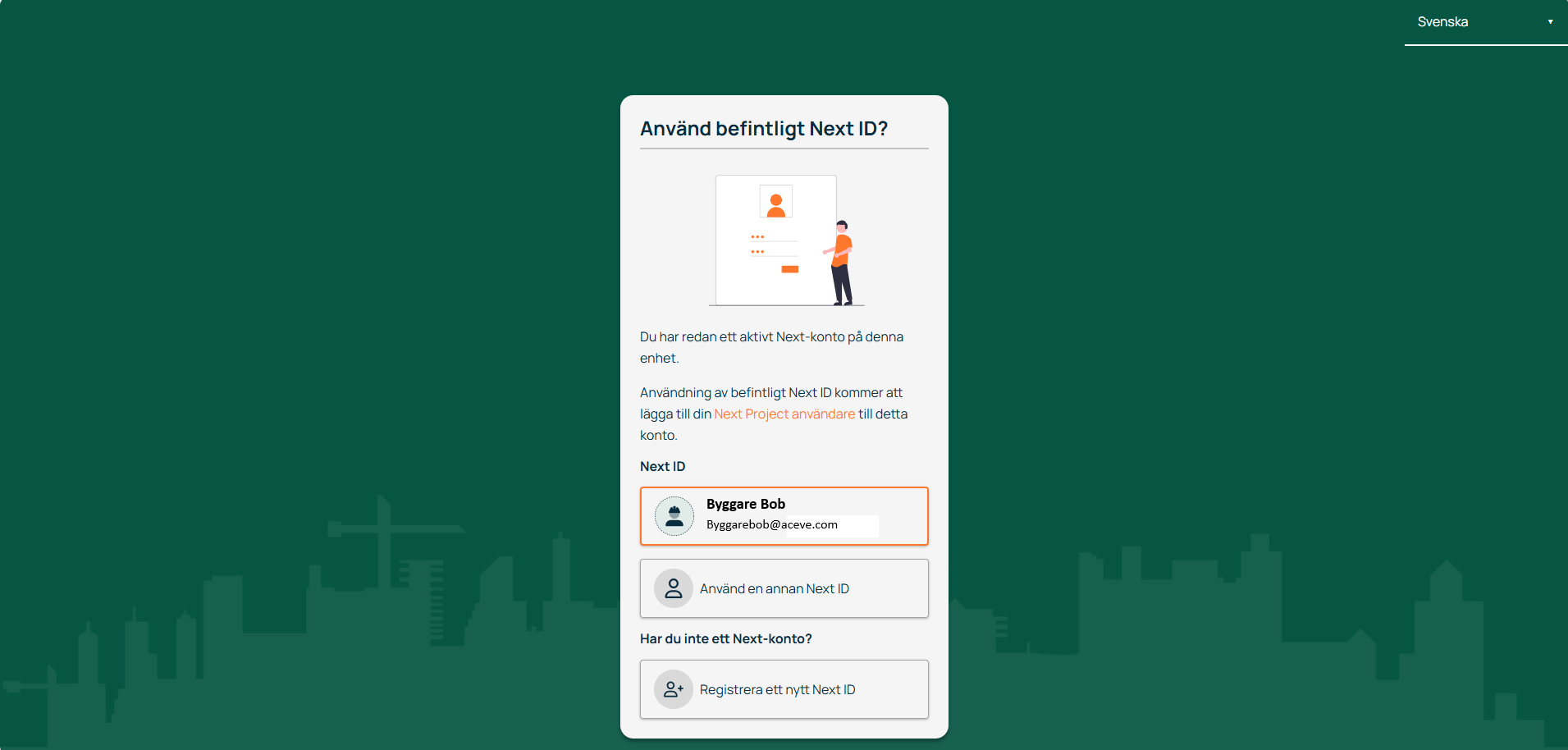 Vid aktivering av One login på en Next Projectdatabas kommer alla användare behöva gå igenom en registreringsprocess för att skapa sitt nya Next ID. Next ID är ett globalt konto som användaren äger själv (inte företaget).