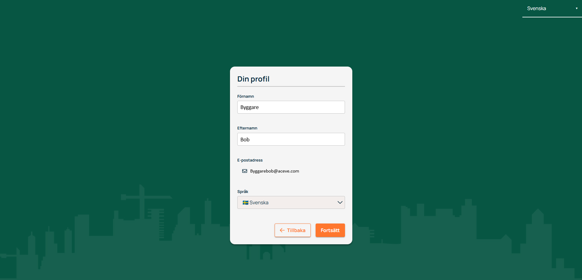Användaren säkerställer att namn och önskat språk för "Din profil" stämmer. Språket föreslås baserat på det språk som din användare har i Next Project databasen som aktiveringen startat ifrån.
