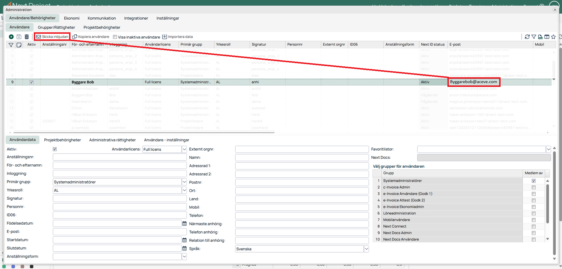 Nya användare som läggs upp efter att aktiveringen är gjord, läggs till precis som tidigare av administratören i respektive Next Project databas, men de kommer aldrig mer kunna/behöva sätta lösenord. När användaren skapats upp, skickas automatiskt ett inbjudningsmail till användarens angivna E-post-adress, något som kommer vara obligatoriskt för en aktiv användare. Det går att skicka om inbjudan om en användare mot förmodan inte fått inbjudningsmailet. Detta görs via en knapp ”Bjud in användare”.